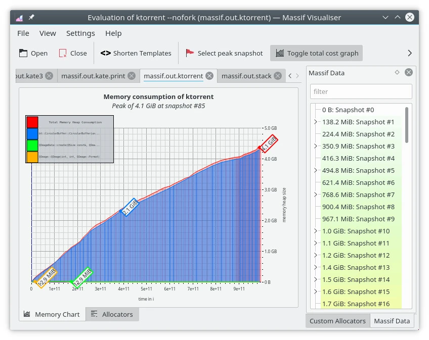 Valgrind is a well know tool to perform analysis of programs. One of its sub tools is massif which aims at giving hints about memory consumption of a program. It comes with a KDE GUI (massif visualizer) to display the profile.